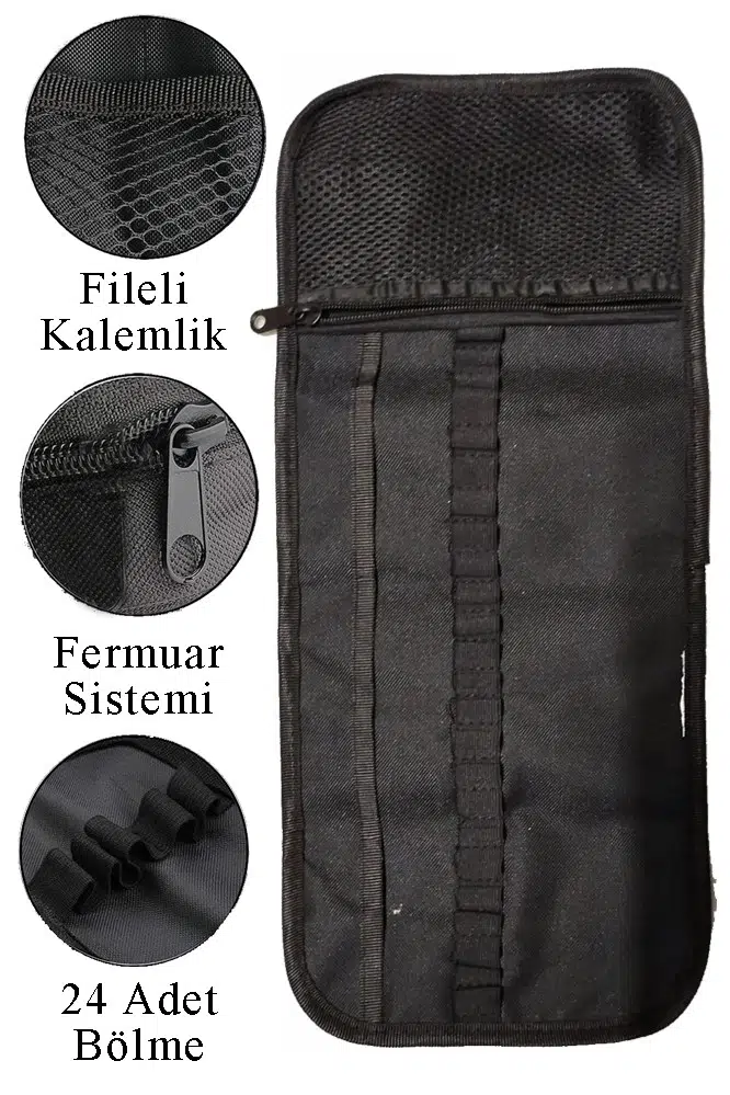 Artlantis Siyah Rulo Bez Kalemlik 24 Bölme ve Fileli Fermuarlı Kalemlik 1 Adet Kalem ve Fırça Sarma Saklama Çantası Düzenleyici