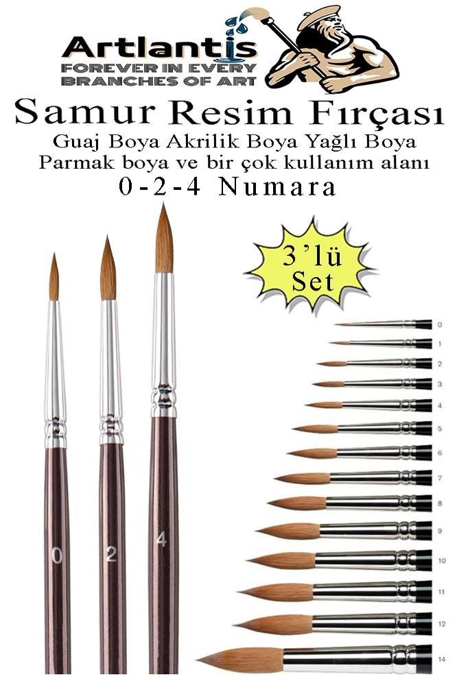 Ürün Adı: Resim Fırçası 0 - 2 - 4 Numara 1 Paket 3 lü Samur Yuvarlak Uçlu Fırça Seti Guaj Sulu Akrilik Yağlı Boya Fırçaları