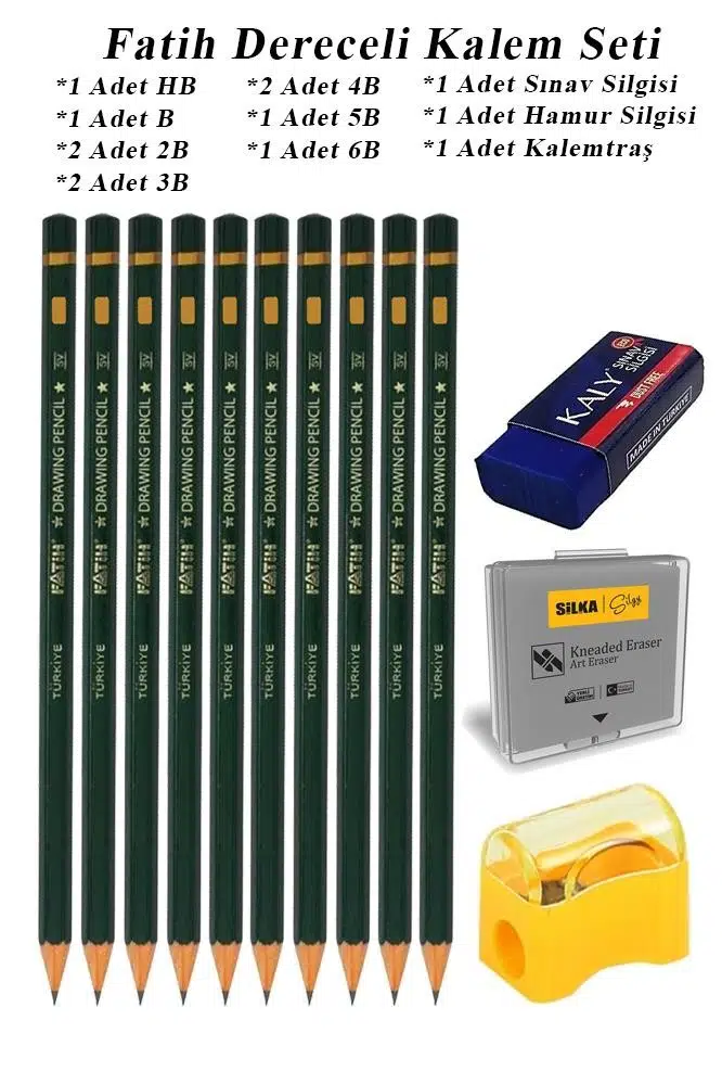 | Etiketler | Resim Kalemi Fatih Dereceli Kalem Seti Karakalem Set HB B 2B 3B 4B 5B 6B 13'lü Set Sınav Silgisi ve Hamr Silgi Kalemtraş |