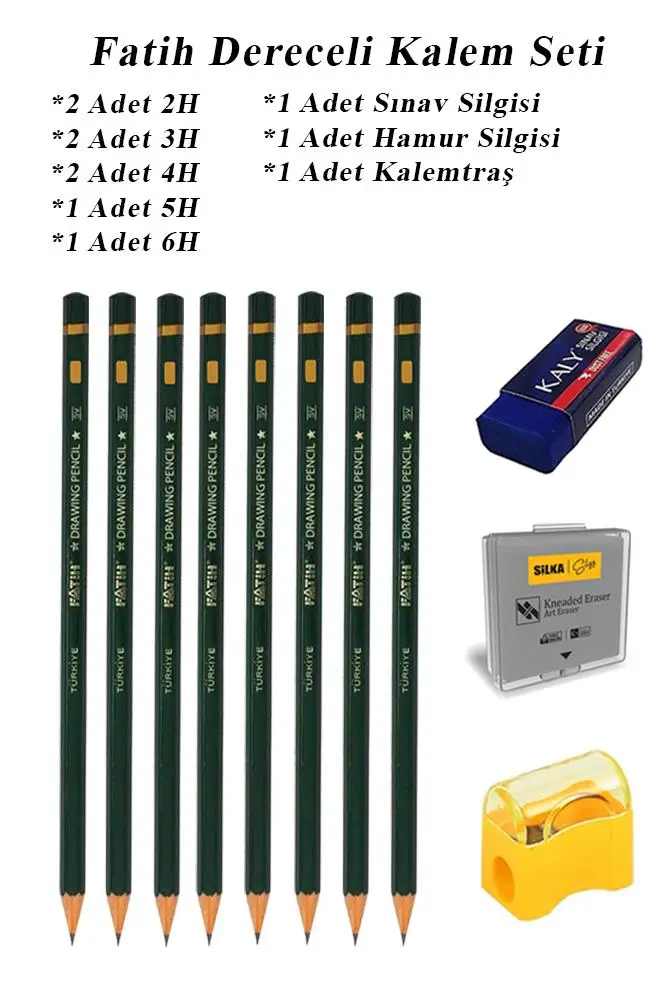 | Etiketler | Resim Kalemi Fatih Dereceli Kalem Seti Karakalem Seti 2H 3H 4H 5H 6H 11'li Set Sınav Silgisi ve Hamur Silgi Kalemtraş |