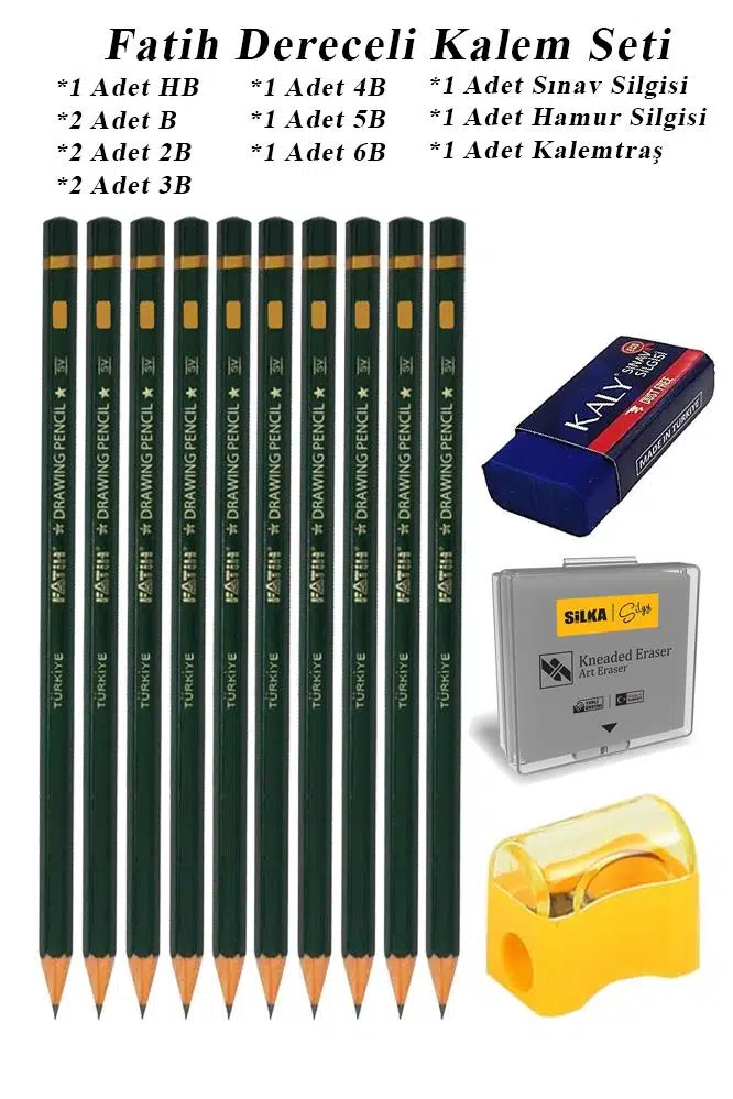 | Etiketler | Resim Kalemi Fatih Dereceli Kalem Seti Karakalem Seti HB B 2B 3B 4B 5B 6B 13'lü Set Sınav Slgisi ve Hamur Slgi Kalemtraş |