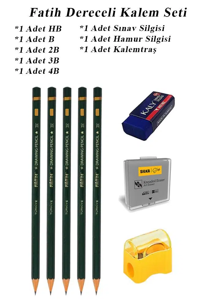 | Etiketler | Resim Kalemi Fatih Dereceli Kalem Seti Karakalem Seti HB B 2B 3B 4B 8'li Set Sınav Silgisi ve Hamur Silgi Kalemtraş |