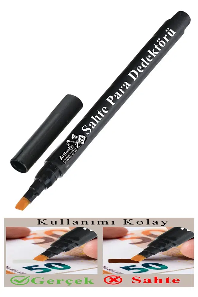 Kalem: Banknotu işaretlediğinizde farklı bir renge dönüşür. Açık sarı veya şeffaf renk, banknotun gerçek olduğu anlamına gelir. Siyah renk ise banknotun sahte olduğu anlamına gelir. Para Kontrol Kalemi Dedektör Kalem: Hafif UV mürekkebiyle, banknotun üzerine gizli işaretler yazabilirsiniz. Para Kontrol Kalemi