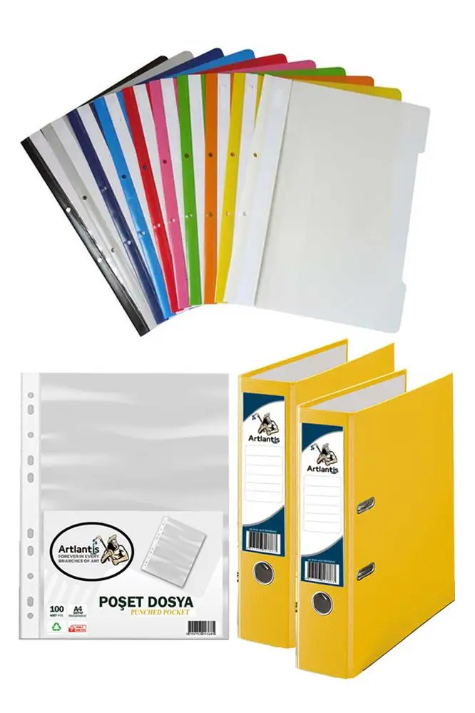 Ürün Adı: Sarı Büro Klasörü Telli Dosya ve Poşet Dosya Seti 2 Adet Büro Klasörü 10 Renk Telli Dosya 100 Adet Poşet Dosya