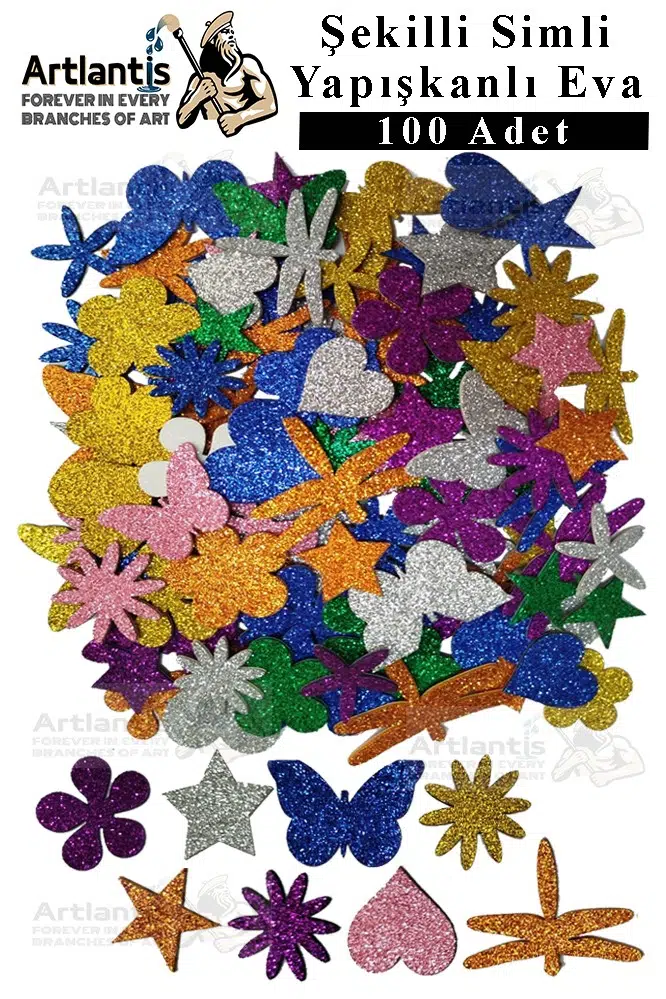 3 cm ve 4 cm boyutlarında karışık 100 adet şekilli simli yapışkanlı eva gönderim yapılacaktır. paket içerisinde Yıldız çiçek kalp kelebek şekilleri mevcuttur