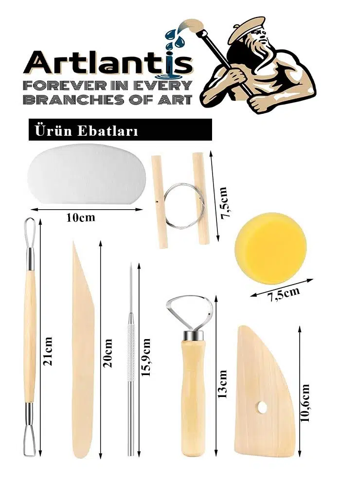- Çift taraflı: Ahşap kil aletlerin bir kısmı çift taraflıdır ve pürüzsüz ahşap kulplar, her bir aletin rahat tutulmasını sağlar.