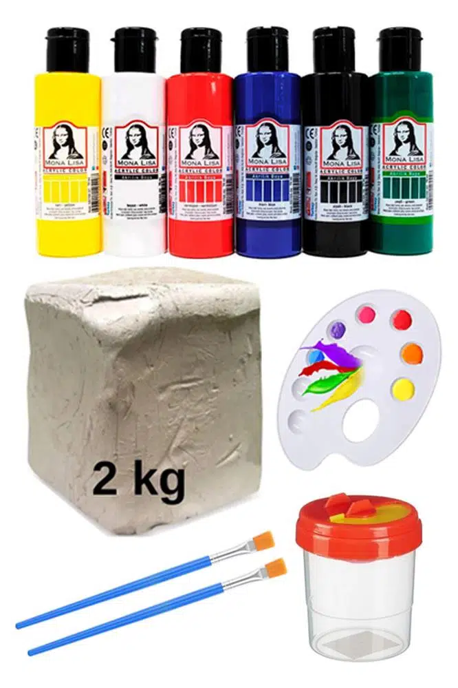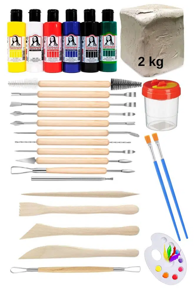 Ürün Adı: Seramik Çömlek Şekillendirme Seti 27 Parça Ebeşuar Kil Modelaj Modelleme Beyaz Kil 6 lı Akrilik Boya Palet Fırça Fırça Temizleme Kabı