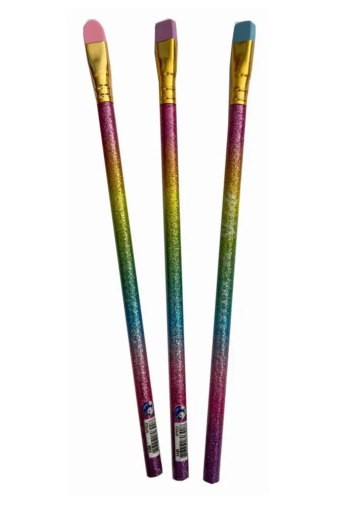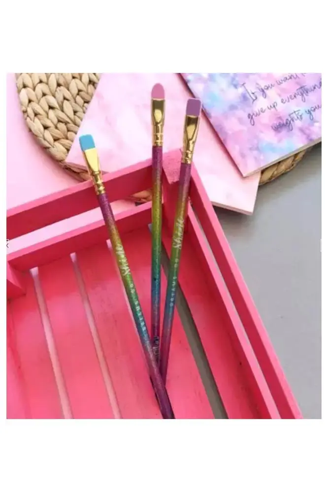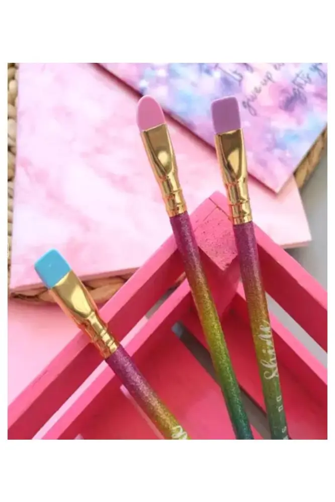 Ürün Adı: Silgi Başlıklı Kurşun Kalem 3 Adet Simli Ve Gold Makyaj Fırçası Görünümlü Kurşun Kalem Soft Renklerde Silgi