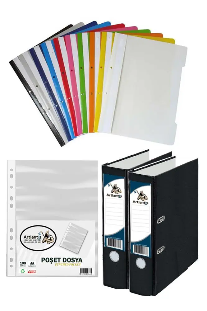 Ürün Adı: Siyah Büro Klasörü Telli Dosya ve Poşet Dosya Seti 2 Adet Büro Klasörü 10 Renk Telli Dosya 100 Adet Poşet Dosya
