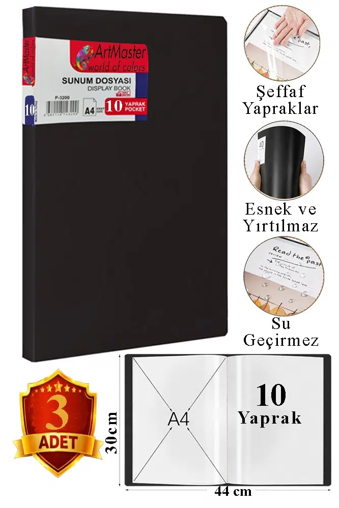 Ürün Adı: Artmaster Siyah Sunum Dosyası 10 lu 3 Adet Poşet Dosyalı Katalog Dosyası 10 Poşetli Kendinden Dosya Plastik Kapaklı