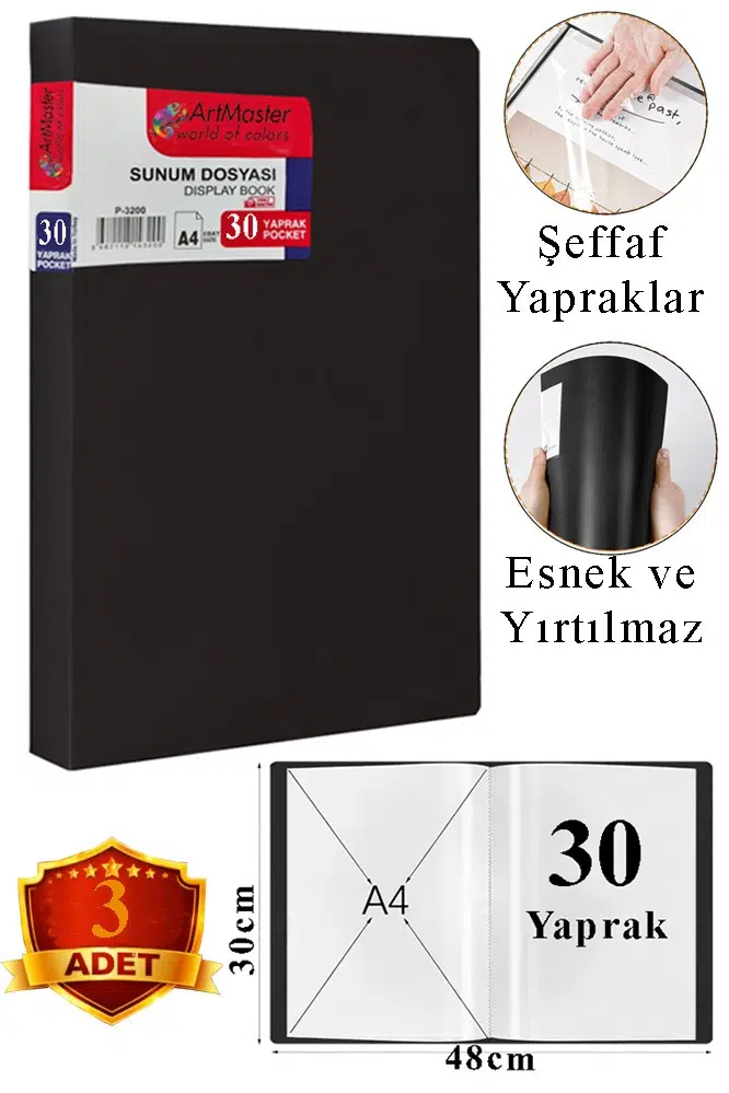 Ürün Adı: Artmaster Siyah Sunum Dosyası 30 lu 3 Adet Poşet Dosyalı Katalog Dosyası 30 Poşetli Kendinden Dosya Plastik Kapaklı