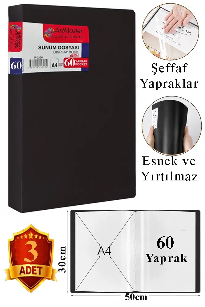Ürün Adı: Artmaster Siyah Sunum Dosyası 60 lı 3 Adet Poşet Dosyalı Katalog Dosyası 60 Poşetli Kendinden Dosya Plastik Kapaklı