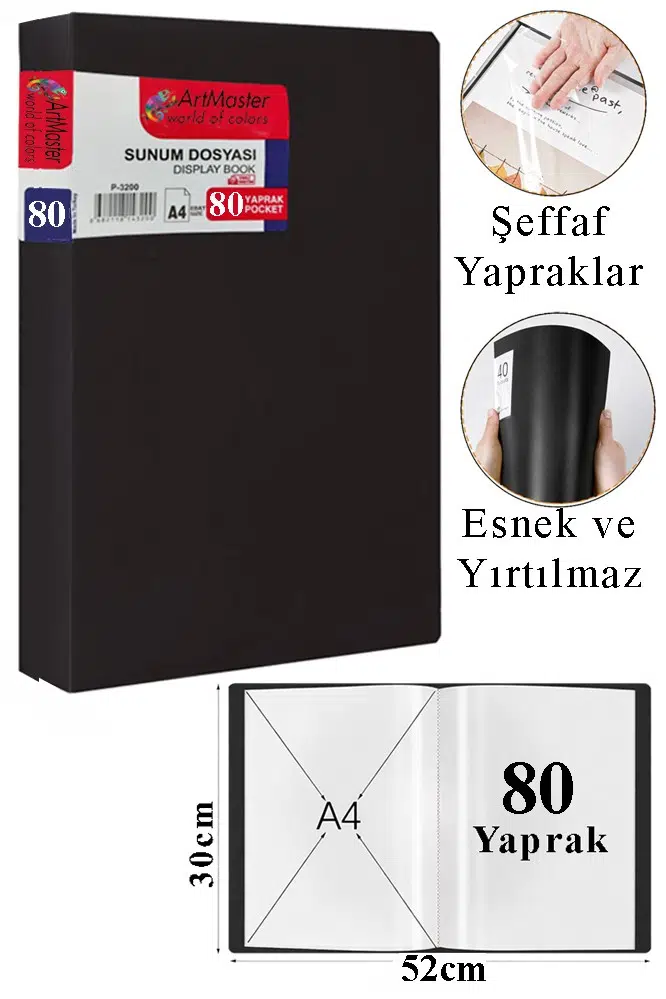 Ürün Adı: Artmaster Siyah Sunum Dosyası 80 li 1 Adet Poşet Dosyalı Katalog Dosyası 80 Poşetli Kendinden Dosya Plastik Kapaklı