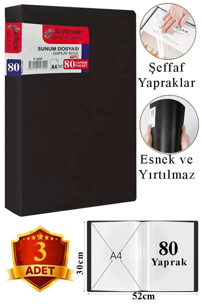 Ürün Adı: Artmaster Siyah Sunum Dosyası 80 li 3 Adet Poşet Dosyalı Katalog Dosyası 80 Poşetli Kendinden Dosya Plastik Kapaklı