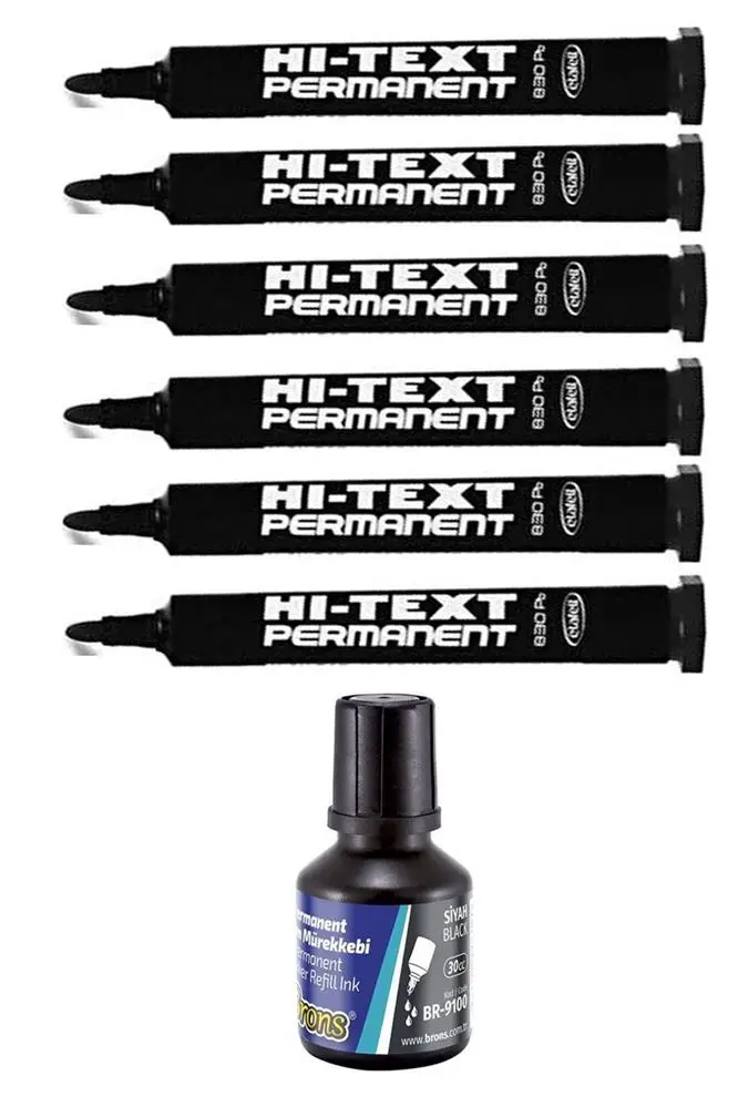 Ürün Adı: Siyah Yuvarlak Uçlu Markör Permanent Kalem 6 Adet Hı-Text Marker Mürekkep Siyah 30 Ml 1 Adet Brons Koli Kalemi
