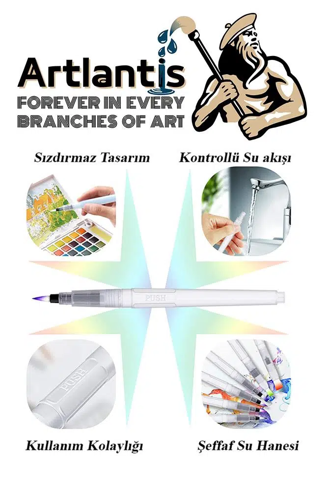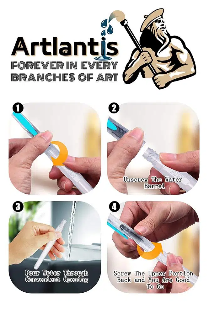 - Artlantis su hazneli fırça kalemi karıştırmak için suyla doldurulabilir veya kendi taşınabilir fırçanızı yapmak için en sevdiğiniz mürekkebi ekleyebilirsiniz. Sadece kullanımdan sonra su ile temizleyin.