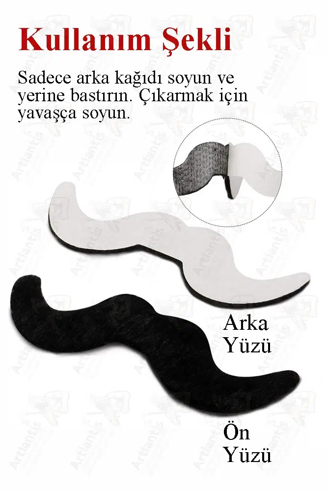 Yapışkan arka yüzeyini soyup burnunuzun altına yerleştirerek kolayca uygulayın. Cildin kuru olduğundan emin olun, çünkü nem yapışkanın gücünü etkileyebilir. Çeşitli stil seçenekleriyle her bıyık farklı bir karakteri temsil edebilir, bu da eğlenceli ve kişiselleştirilmiş bir deneyim için farklı yüz şekillerine ve kostümlere uyum sağlamayı kolaylaştırır.