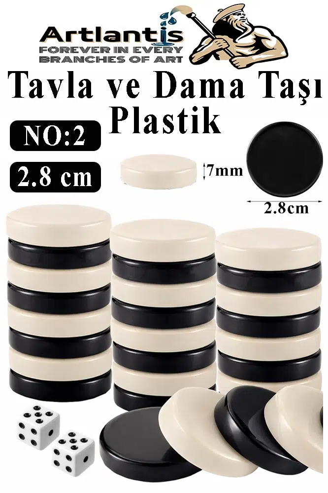 Ürün Adı: Tavla Pulu Küçük Boy No:2 1 Paket Tavla ve Dama Taşı Plastik 2.8 cm Zar Hediyeli Gri Siyah 28 mm Oyun Pulu