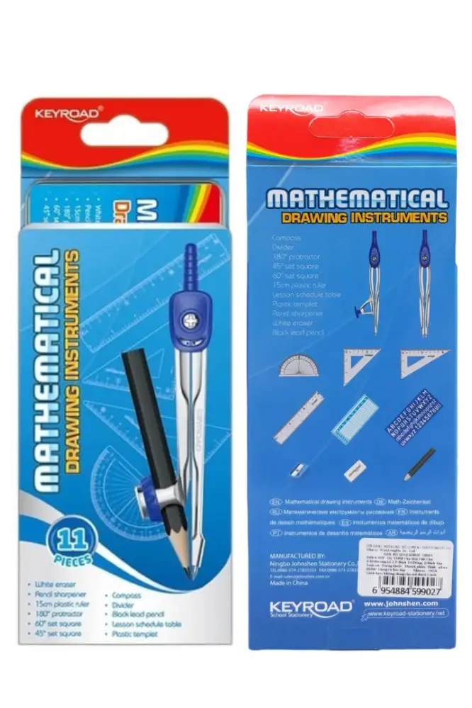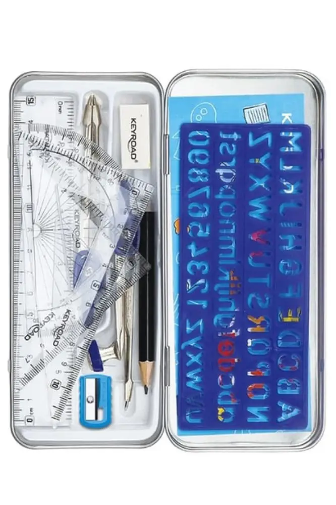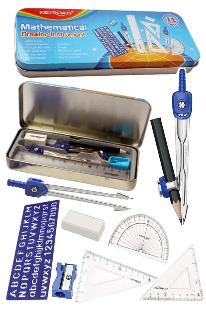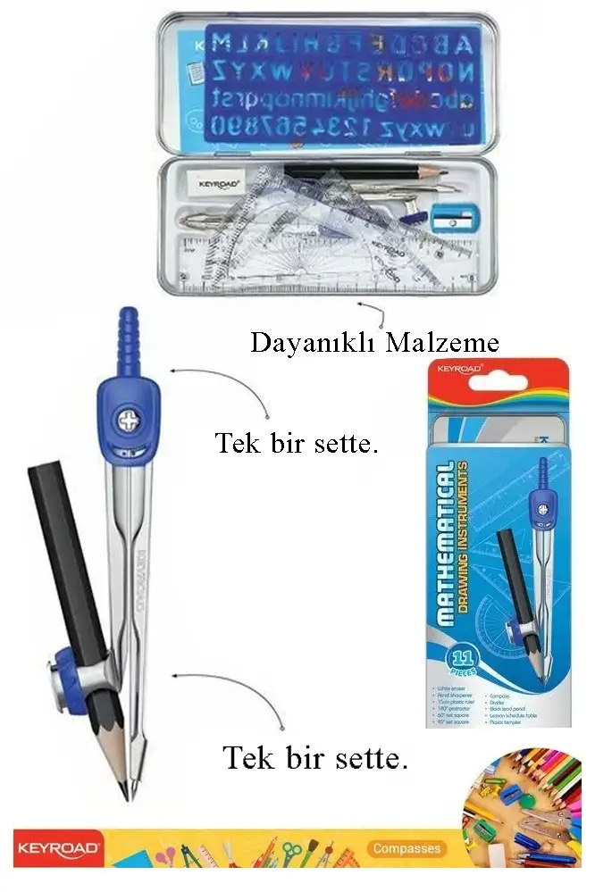 Ürün Adı: Teknik Çizim Seti 11 Parça Keyroad Metal Pergel Gönye Açı Ölçer İletki Harf Şablonu Metal Kutulu 971708
