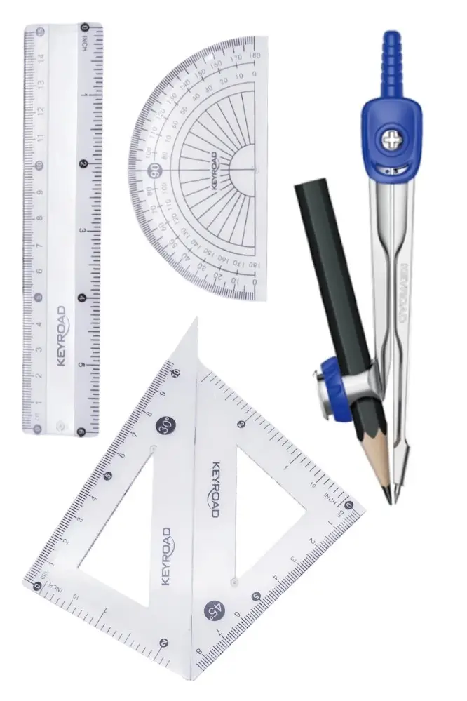 - Metal Pergel - Ayırıcı - Silgi - Kalemtıraş - 180* açıölçer - 15 cm plastik cetvel - Ders çizelgesi tablosu - Plastik şablon - 45* Gönye - 60* Gönye - Siyah kurşun kalem