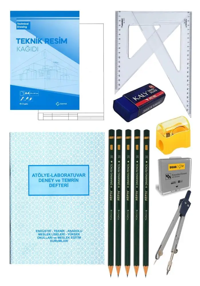 | Etiketler | Teknik Resim Seti 13 Parça 1 Paket Teknik Resim Defteri Gönye Dereceli Kalem Metal Pergel Silgi Kalemtraş Hamur Silgi Atlye Laboratuvar Deney ve Temrin Defteri |