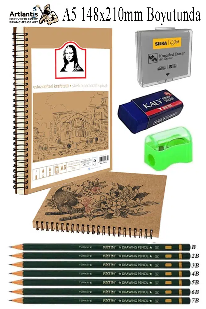 Ürün Adı: Telli A5 Kraft Eskiz Defteri Spiralli 50 Yaprak Karakalem Çizim Seti Fatih Dereceli Kalem Yandan Açmalı Sketch Pad Sigi