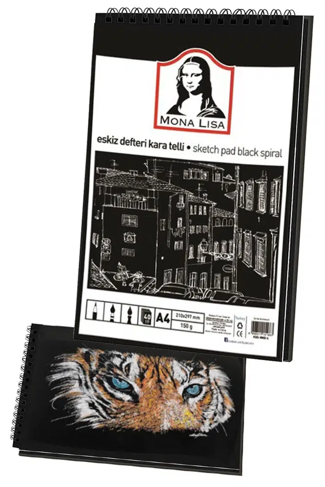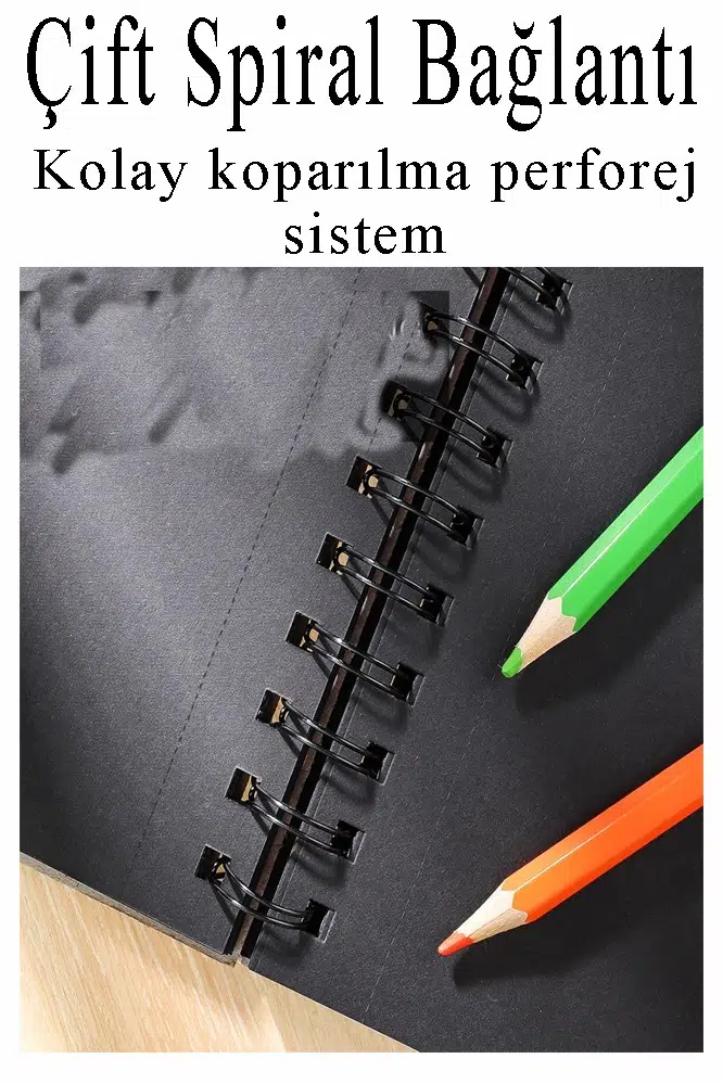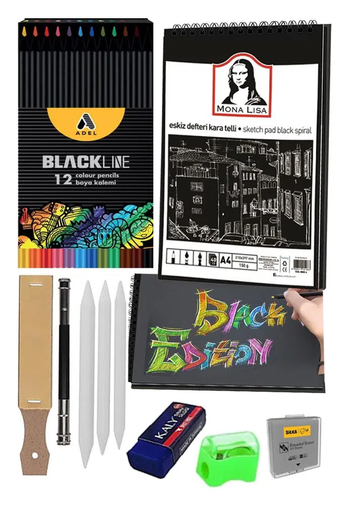 Telli Eskiz Defteri Siyah A4 1 Adet Spiralli 150 gr 40 Yaprak 12 Renk Kuruboya Gölgelendirme Zımpara Kalem Uzatma Silgi
