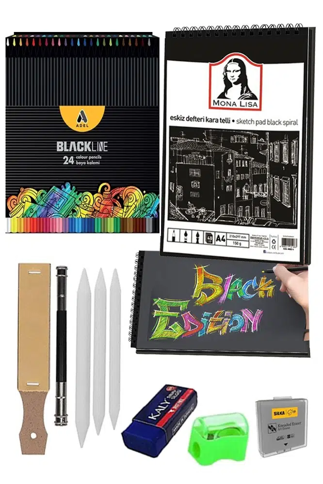 Ürün Adı: Telli Eskiz Defteri Siyah A4 1 Adet Spiralli 150 gr 40 Yaprak 24 Renk Kuruboya Gölgelendirme Zımpara Kalem Uzatma Silgi