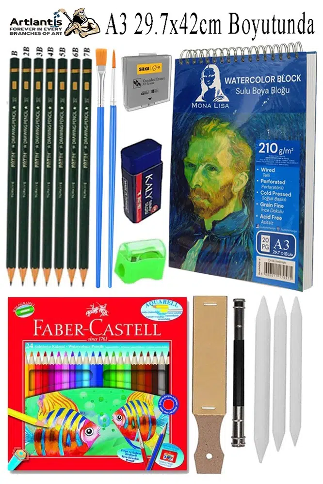 Ürün Adı: Telli Suluboya Bloğu Kağıdı A3 210gr 20 Yaprak Dokulu Gölgelendirme Zımpara 24 Renk Aquarell Kuruboya Dereceli Uzatma 21 x 29,7 cm