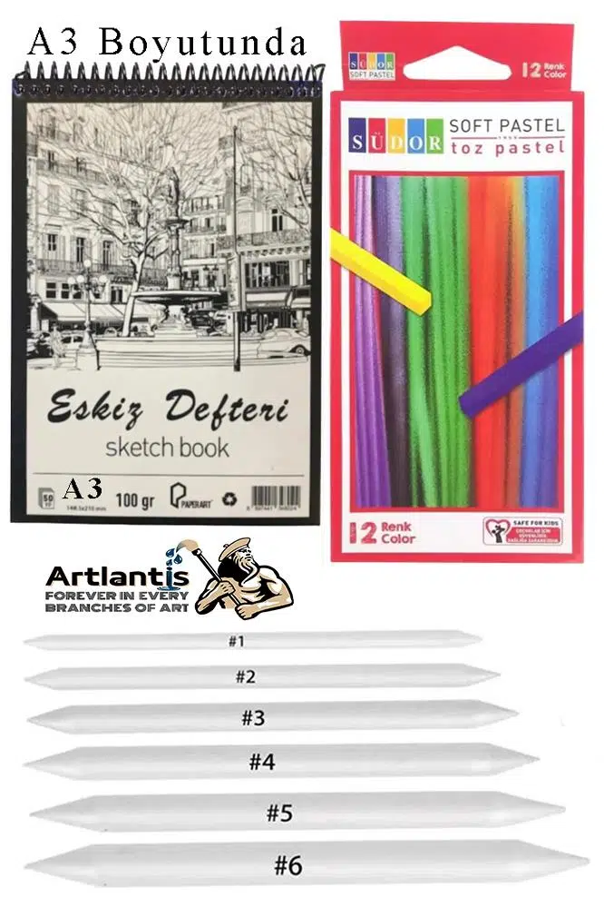 Ürün Adı: Toz Pastel Boya 12 Renk A3 Eskiz Defteri Pastel Dağıtma Kalemi 1 Paket Toz Soft Pastel Boya 12 li Yumuşak Pastel Gölgele