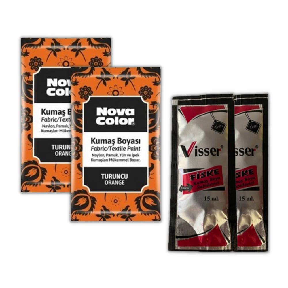 Ürün Adı: Nova Color Turuncu toz kumaş boyası 12 gr 2 adet Visser Kumaş Sabitleyici Fiske 15 ml 2 adet