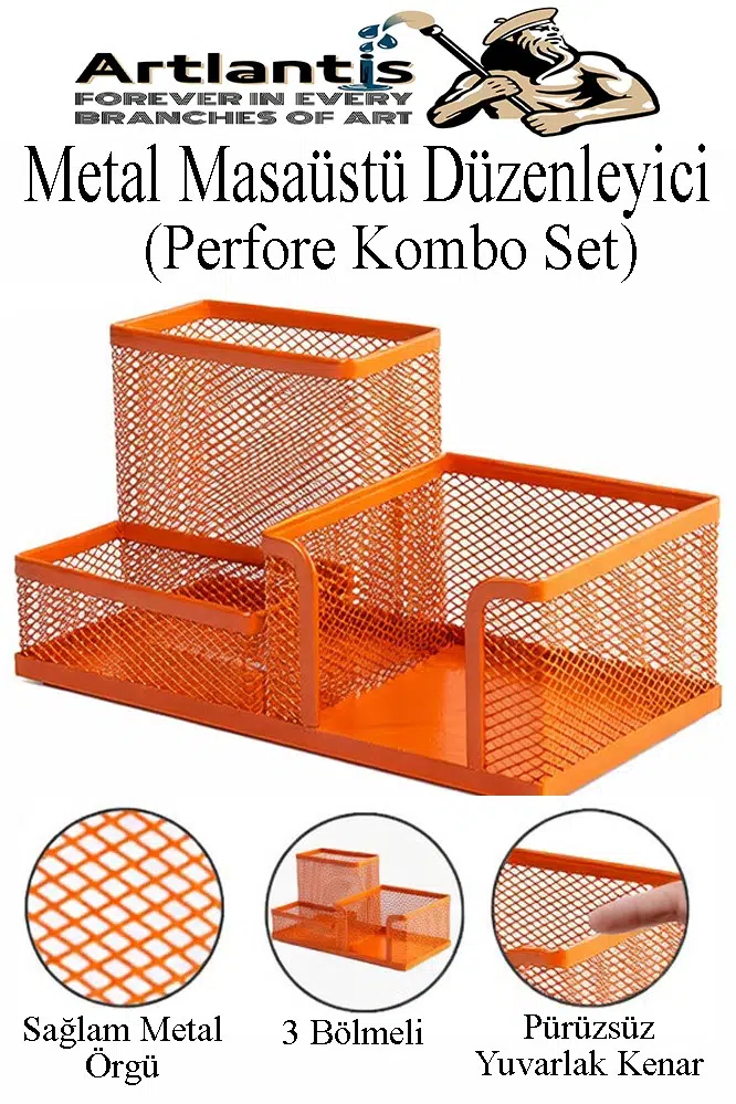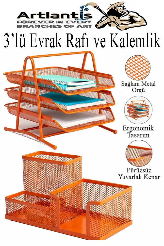 Ürün Adı: Artlantis Turuncu Metal Evrak Rafı 3 lü ve Masaüstü Kalemlik 1 Paket Masaüstü A4 Dosya 3 Katlı Düzenleyici Kağıt Tepsisi Metal