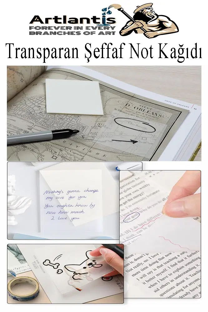 Transparan Yapışkan Notlar: Bu ideal boyutlu 75x75 mm yapışkan notlar yağ bazlı kalemler, tükenmez kalemler, kurşun kalemlerle yazmak için uygundur. Vurgulayıcılar veya su bazlı kalemler için önerilmez çünkü kurumaları uzun zaman alabilir.