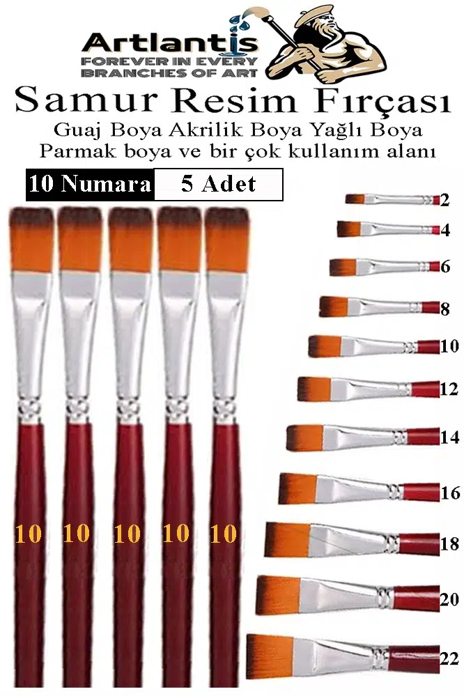 Ürün Adı: Yassı Uçlu 10 Numara Resim Fırçası 5 li 1 Paket Samur Kesik Uçlu Fırça Seti Guaj Sulu Akrilik Yağlı Boya Fırçaları