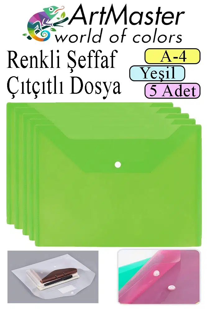 Ürün Adı: Artmaster Yeşil A4 Çıtçıtlı Dosya Şeffaf Renkli Zarf Dosya 5 Adet Çıt Çıtlı Dosya Su Geçirmez 100 Yaprak Kapasite