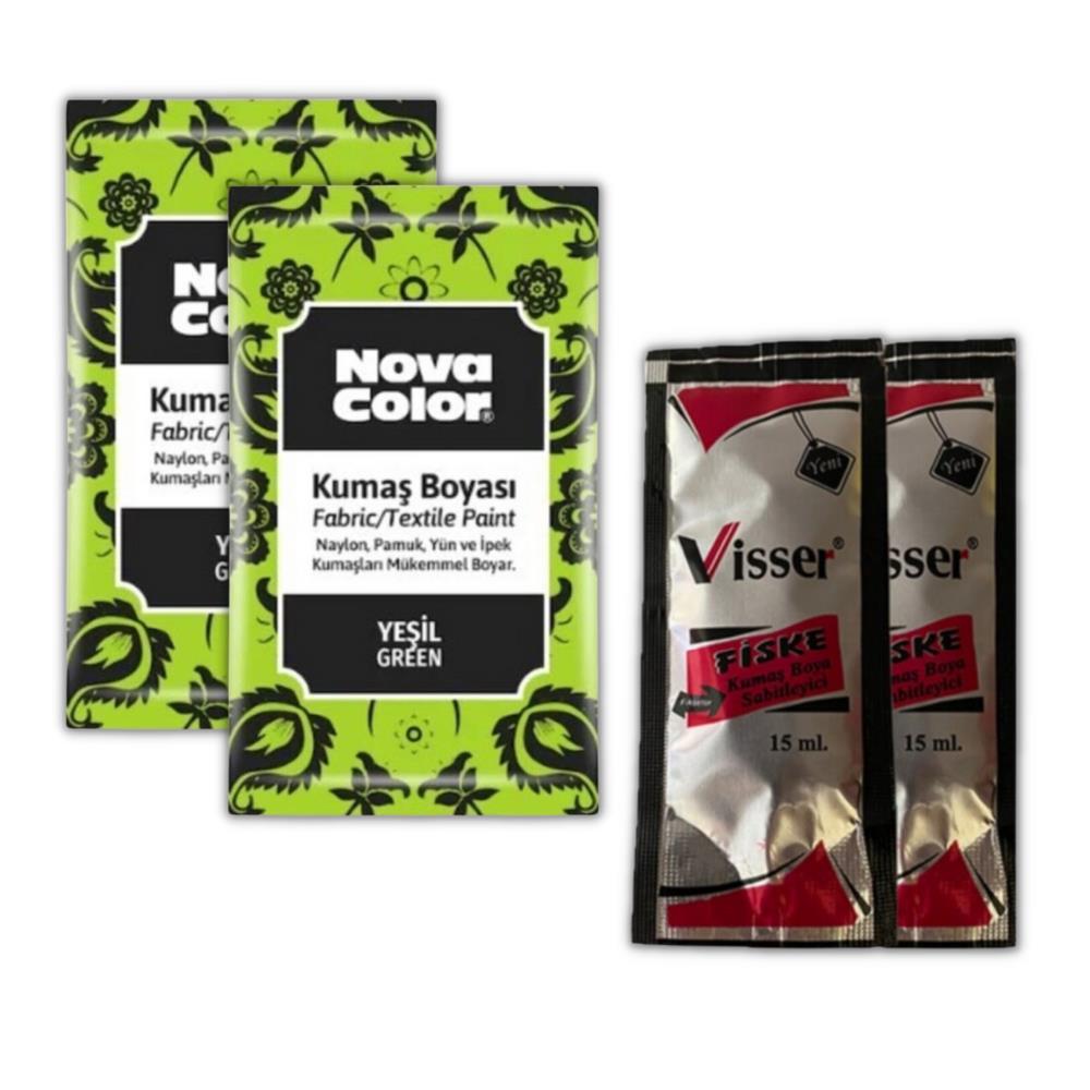 Ürün Adı: Nova Color Yeşil toz kumaş boyası 12 gr 2 adet Visser Kumaş Sabitleyici Fiske 15 ml 2 adet