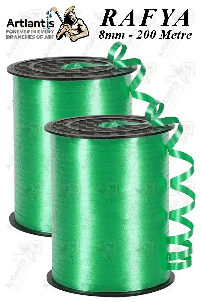Ürün Adı: Yeşil Rafya Şerit Kurdela 2 Adet 8mm 200 Metre Rabant Rafya Renkli Hediye Paketleme İpi Kurdela Balon Bağlama Ponpon