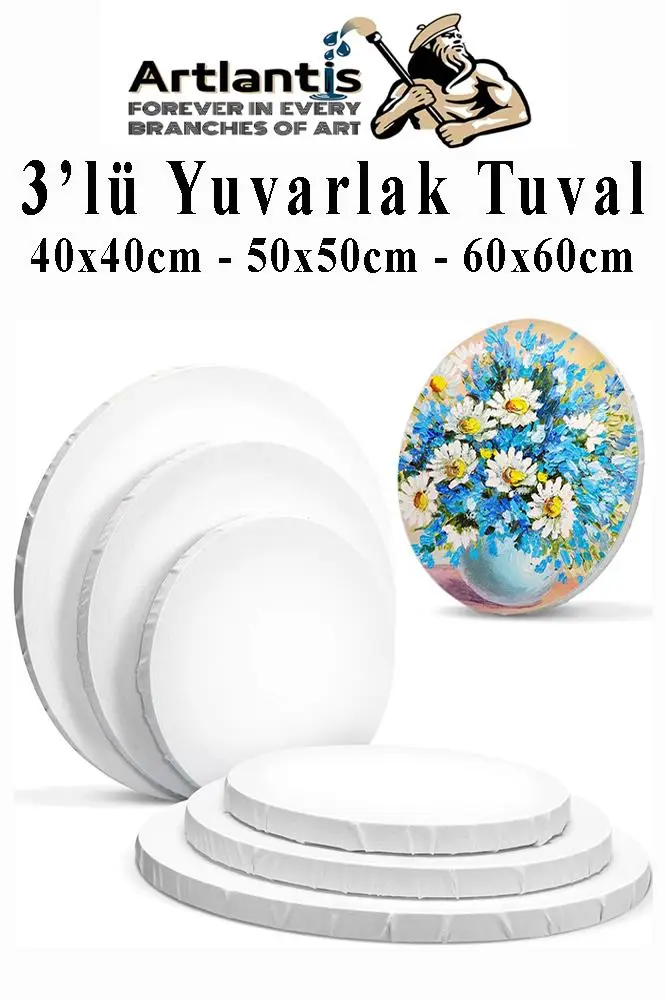 Ürün Adı: Yuvarlak Tuval 40x40 50x50 60x60 3 Adet Arkadan Zımbalı Astarlı Resim Tuvali Daire Tuval Akrilik Boya Yağlı Boya
