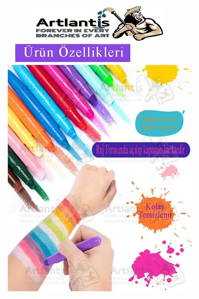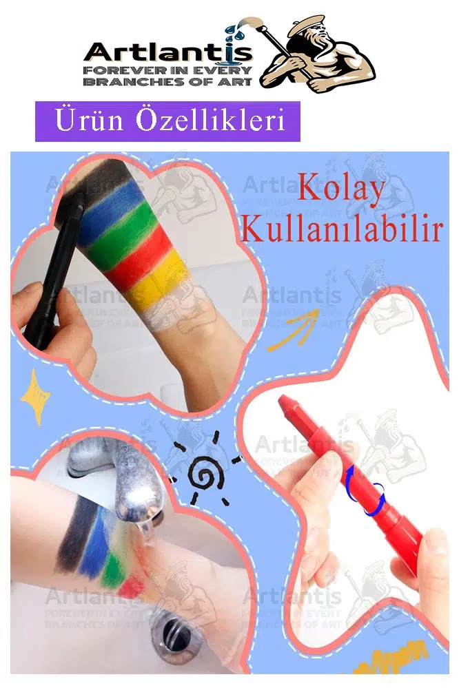 Kolay Uygulama ve Kalıcılık:Krem bazlı yapısı, yüz boyasını kolayca uygulamanıza yardımcı olur. Renkler cilde mükemmel bir şekilde tutunur ve uzun süre dayanıklılık sağlar. Su bazlıdır, bu da temizlenmesini kolaylaştırır.